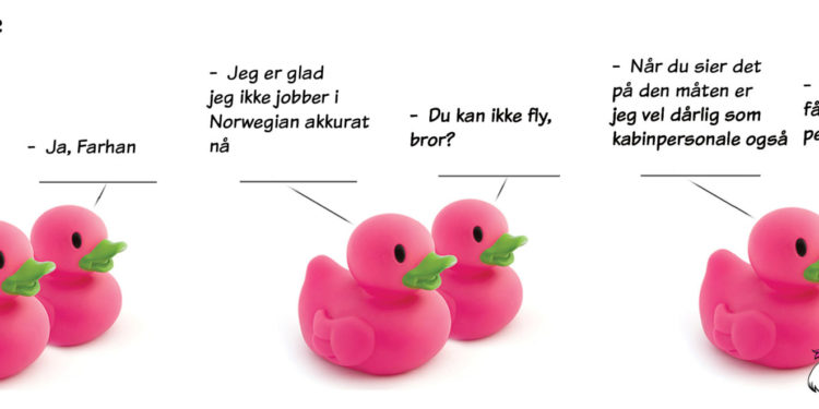 | – Du, Christer? | – Ja, Farhan | – Jeg er glad jeg ikke jobber i Norwegian akkurat nå | – Du kan ikke fly, bror? | – Når du sier det på den måten er jeg vel dårlig som kabinpersonale også | – Nettopp! Du hadde fått fyken lenge før permisjon